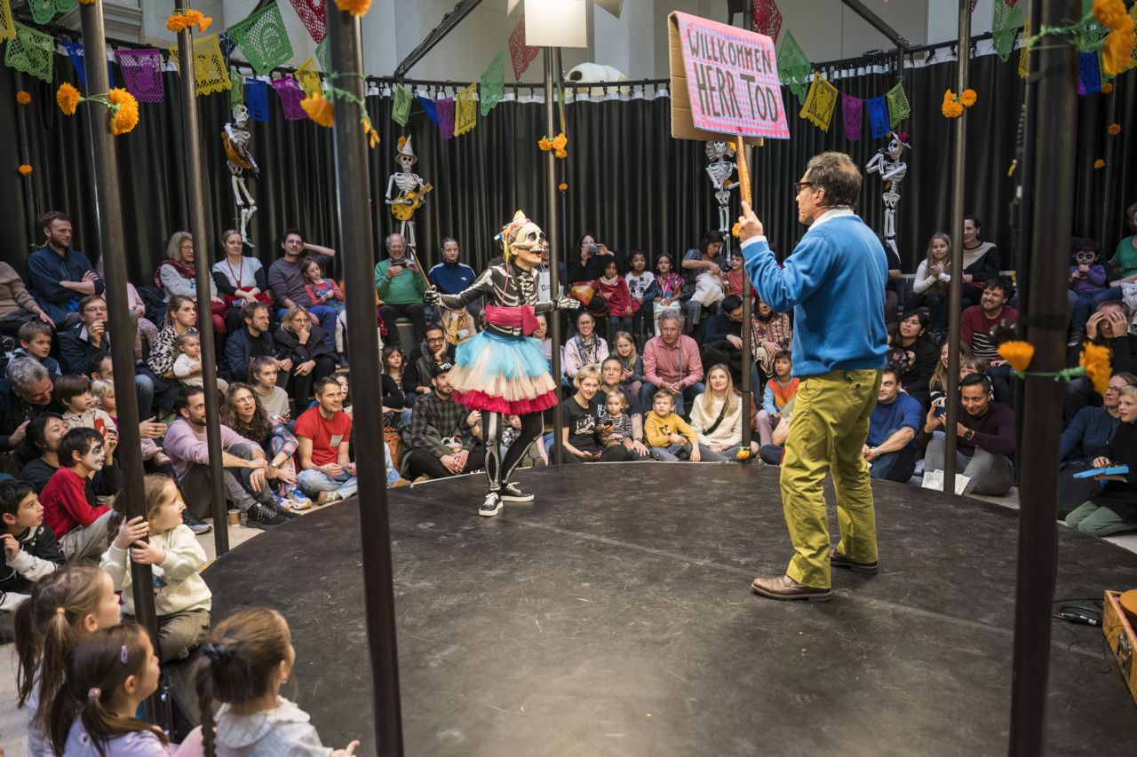 Wie findet der Tod eigentlich seinen Job? Macht es ihn manchmal traurig, dass viele Menschen ihn nicht mögen? Und warum können nicht alle Menschen ewig leben? Der Tod kommt hier auf die Bühne und wird von einer Journalistin und den Kindern im Publikum interviewt. Dabei erfahren die Kinder, weshalb die Verstorbenen nie ganz verschwinden, wenn wir an sie denken.
